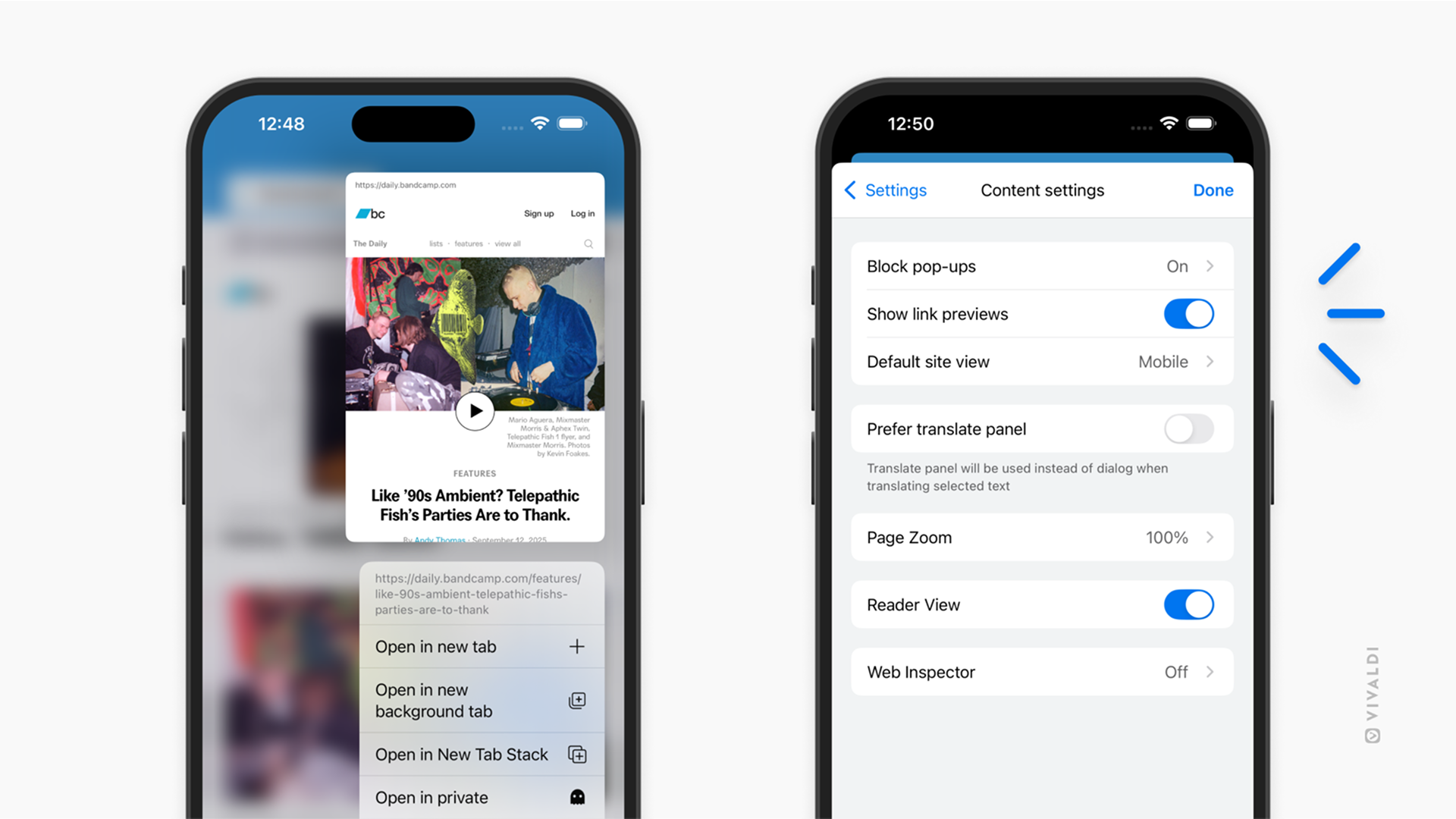 Vivaldi за iOS долази са траком картица познатој из десктоп прегледача. За омогућавање/онемогућавање траке картица: